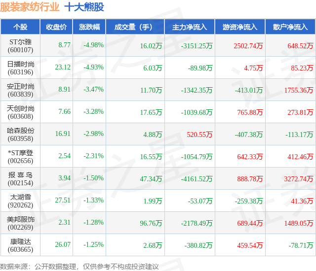 个股表现方面,服装家纺行业当日领跌股为ST尔雅(600107),该股当日报收8.77,下跌4.98%,成交量16.02万,主力资金净流出3151.25万元。日播时尚(603196)以下跌4.93%紧随其后,该股当日成交量6.03万,主力资金净流出89.98万元。除此之外,安正时尚(603839)、天创时尚(603608)、哈森股份(603958)均进入当日熊股之列。具体个股列表见下表: