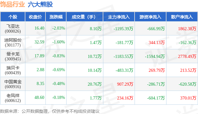 个股表现方面,饰品行业当日领跌股为飞亚达(000026),该股当日报收16.4,下跌2.03%,成交量8.1万,主力资金净流出1195.39万元。迪阿股份(301177)以下跌1.6%紧随其后,该股当日成交量1.47万,主力资金净流出181.77万元。除此之外,曼卡龙(300945)、瑞贝卡(600439)、中国黄金(600916)均进入当日熊股之列。具体个股列表见下表: