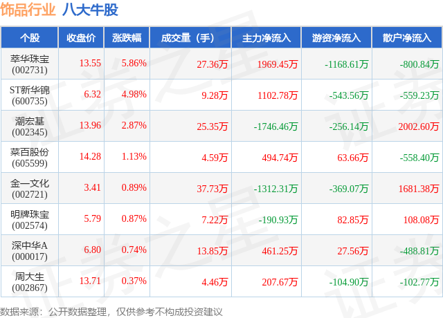 个股表现方面,饰品行业当日领涨股为萃华珠宝(002731),该股当日报收13.55,上涨5.86%,成交量27.36万,主力资金净流入1969.45万元。ST新华锦(600735)以上涨4.98%紧随其后,该股当日成交量9.28万,主力资金净流入1102.78万元。除此之外,潮宏基(002345)、菜百股份(605599)、金一文化(002721)均进入当日牛股之列。具体个股列表见下表: