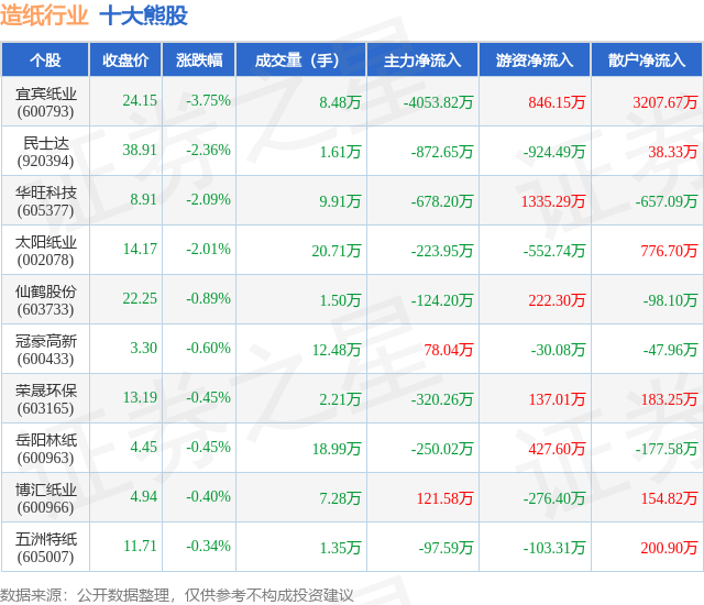 个股表现方面,造纸行业当日领跌股为宜宾纸业(600793),该股当日报收24.15,下跌3.75%,成交量8.48万,主力资金净流出4053.82万元。民士达(920394)以下跌2.36%紧随其后,该股当日成交量1.61万,主力资金净流出872.65万元。除此之外,华旺科技(605377)、太阳纸业(002078)、仙鹤股份(603733)均进入当日熊股之列。具体个股列表见下表: