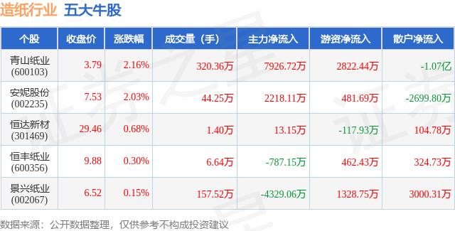 个股表现方面,造纸行业当日领涨股为青山纸业(600103),该股当日报收3.79,上涨2.16%,成交量320.36万,主力资金净流入7926.72万元。安妮股份(002235)以上涨2.03%紧随其后,该股当日成交量44.25万,主力资金净流入2218.11万元。除此之外,恒达新材(301469)、恒丰纸业(600356)、景兴纸业(002067)均进入当日牛股之列。具体个股列表见下表: