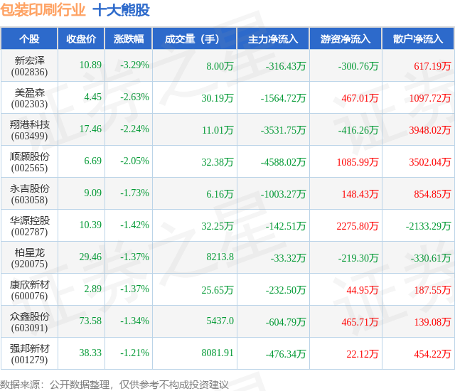 个股表现方面,包装印刷行业当日领跌股为新宏泽(002836),该股当日报收10.89,下跌3.29%,成交量8.0万,主力资金净流出316.43万元。美盈森(002303)以下跌2.63%紧随其后,该股当日成交量30.19万,主力资金净流出1564.72万元。除此之外,翔港科技(603499)、顺灏股份(002565)、永吉股份(603058)均进入当日熊股之列。具体个股列表见下表: