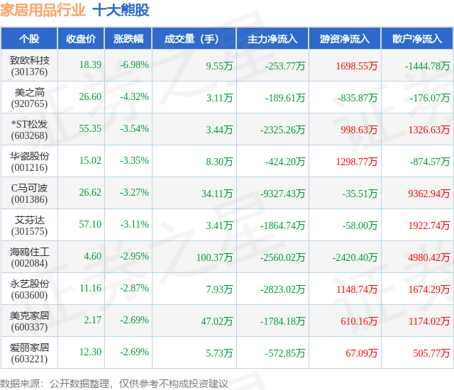个股表现方面,家居用品行业当日领跌股为致欧科技(301376),该股当日报收18.39,下跌6.98%,成交量9.55万,主力资金净流出253.77万元。美之高(920765)以下跌4.32%紧随其后,该股当日成交量3.11万,主力资金净流出189.61万元。除此之外,*ST松发(603268)、华瓷股份(001216)、C马可波(001386)均进入当日熊股之列。具体个股列表见下表: