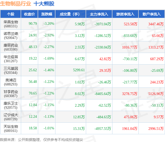 个股表现方面,生物制品行业当日领跌股为荣昌生物(688331),该股当日报收90.79,下跌3.2%,成交量5.98万,主力资金净流出3971.04万元。诺思兰德(920047)以下跌2.92%紧随其后,该股当日成交量3.12万,主力资金净流出1286.52万元。除此之外,康辰药业(603590)、华兰疫苗(301207)、三元基因(920344)均进入当日熊股之列。具体个股列表见下表: