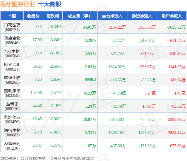 个股表现方面,医疗服务行业当日领跌股为百花医药(600721),该股当日报收9.12,下跌5.3%,成交量34.01万,主力资金净流入1135.22万元。药康生物(688046)以下跌3.24%紧随其后,该股当日成交量3.2万,主力资金净流出432.27万元。除此之外,*ST生物(000504)、阳光诺和(688621)、南模生物(688265)均进入当日熊股之列。具体个股列表见下表: