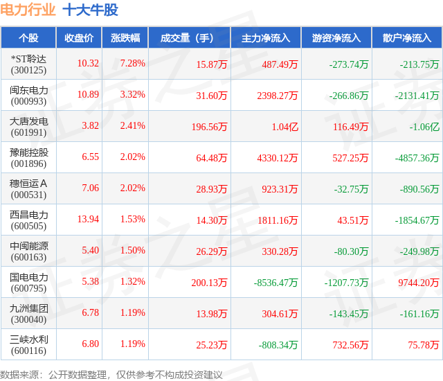 个股表现方面,电力行业当日领涨股为*ST聆达(300125),该股当日报收10.32,上涨7.28%,成交量15.87万,主力资金净流入487.49万元。闽东电力(000993)以上涨3.32%紧随其后,该股当日成交量31.6万,主力资金净流入2398.27万元。除此之外,大唐发电(601991)、豫能控股(001896)、穗恒运A(000531)均进入当日牛股之列。具体个股列表见下表: