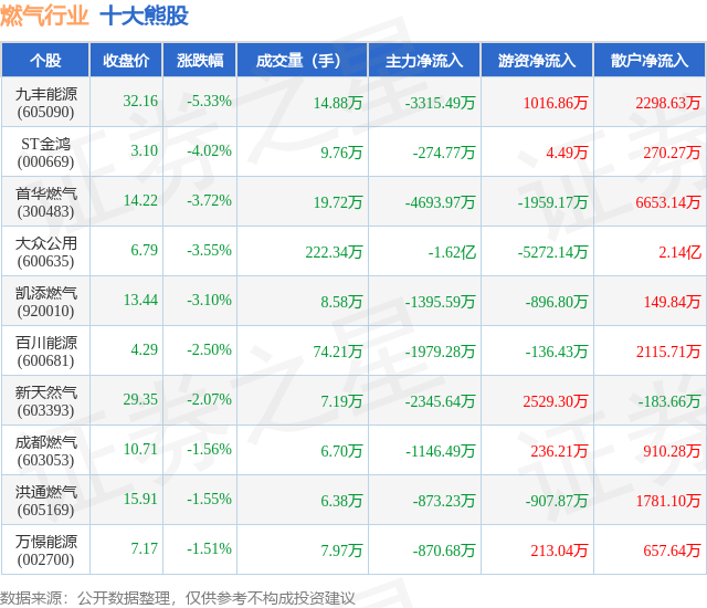 个股表现方面,燃气行业当日领跌股为九丰能源(605090),该股当日报收32.16,下跌5.33%,成交量14.88万,主力资金净流出3315.49万元。ST金鸿(000669)以下跌4.02%紧随其后,该股当日成交量9.76万,主力资金净流出274.77万元。除此之外,首华燃气(300483)、大众公用(600635)、凯添燃气(920010)均进入当日熊股之列。具体个股列表见下表: