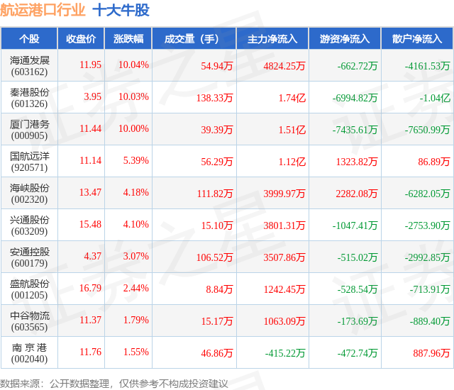 个股表现方面,航运港口行业当日领涨股为海通发展(603162),该股当日报收11.95,上涨10.04%,成交量54.94万,主力资金净流入4824.25万元。秦港股份(601326)以上涨10.03%紧随其后,该股当日成交量138.33万,主力资金净流入1.74亿元。除此之外,厦门港务(000905)、国航远洋(920571)、海峡股份(002320)均进入当日牛股之列。具体个股列表见下表: