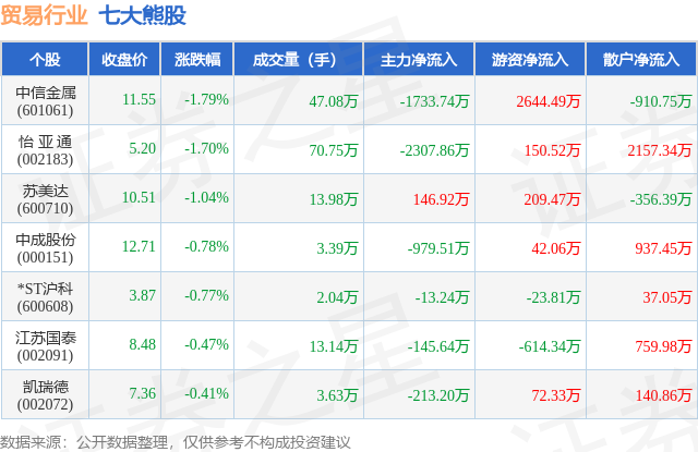 个股表现方面,贸易行业当日领跌股为中信金属(601061),该股当日报收11.55,下跌1.79%,成交量47.08万,主力资金净流出1733.74万元。怡 亚 通(002183)以下跌1.7%紧随其后,该股当日成交量70.75万,主力资金净流出2307.86万元。除此之外,苏美达(600710)、中成股份(000151)、*ST沪科(600608)均进入当日熊股之列。具体个股列表见下表: