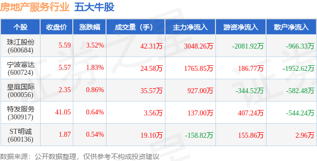 个股表现方面,房地产服务行业当日领涨股为珠江股份(600684),该股当日报收5.59,上涨3.52%,成交量42.31万,主力资金净流入3048.26万元。宁波富达(600724)以上涨1.83%紧随其后,该股当日成交量24.58万,主力资金净流入1765.85万元。除此之外,皇庭国际(000056)、特发服务(300917)、ST明诚(600136)均进入当日牛股之列。具体个股列表见下表: