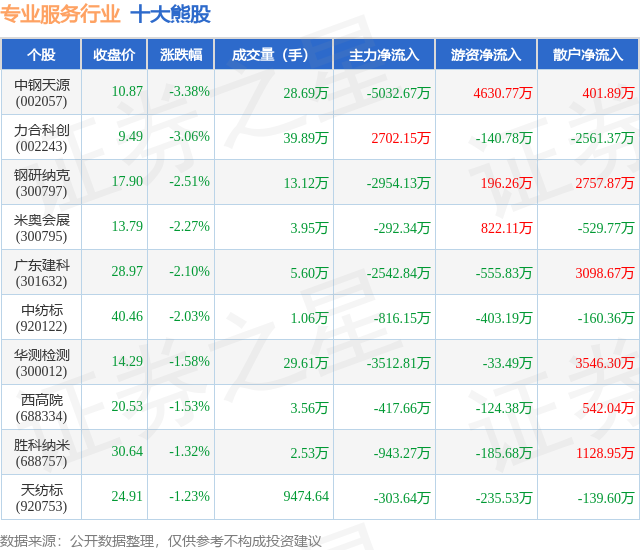 个股表现方面,专业服务行业当日领跌股为中钢天源(002057),该股当日报收10.87,下跌3.38%,成交量28.69万,主力资金净流出5032.67万元。力合科创(002243)以下跌3.06%紧随其后,该股当日成交量39.89万,主力资金净流入2702.15万元。除此之外,钢研纳克(300797)、米奥会展(300795)、广东建科(301632)均进入当日熊股之列。具体个股列表见下表: