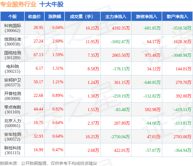 个股表现方面,专业服务行业当日领涨股为科锐国际(300662),该股当日报收28.95,上涨6.04%,成交量10.25万,主力资金净流入4192.35万元。信测标准(300938)以上涨2.6%紧随其后,该股当日成交量11.95万,主力资金净流出1692.47万元。除此之外,国缆检测(301289)、电科院(300215)、安邦护卫(603373)均进入当日牛股之列。具体个股列表见下表: