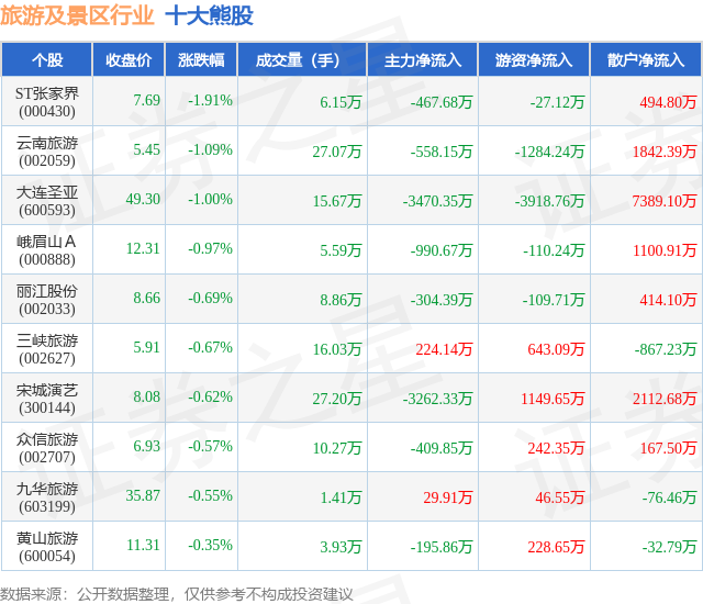 个股表现方面,旅游及景区行业当日领跌股为ST张家界(000430),该股当日报收7.69,下跌1.91%,成交量6.15万,主力资金净流出467.68万元。云南旅游(002059)以下跌1.09%紧随其后,该股当日成交量27.07万,主力资金净流出558.15万元。除此之外,大连圣亚(600593)、峨眉山A(000888)、丽江股份(002033)均进入当日熊股之列。具体个股列表见下表: