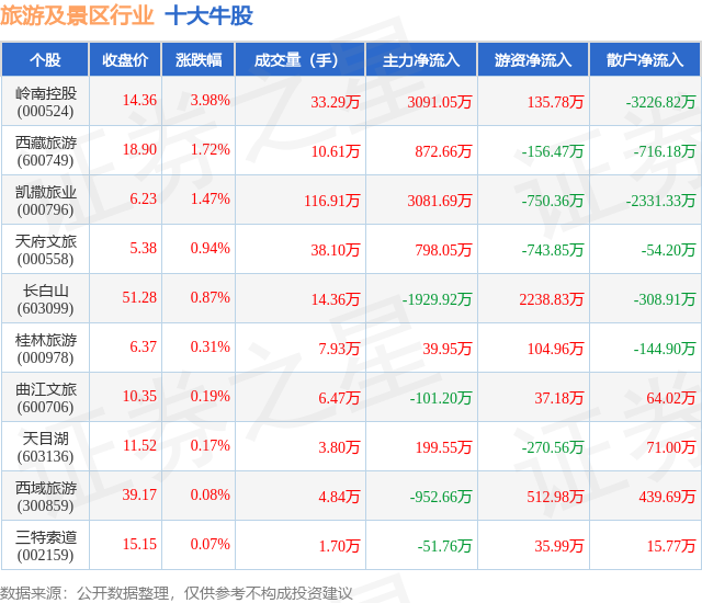 个股表现方面,旅游及景区行业当日领涨股为岭南控股(000524),该股当日报收14.36,上涨3.98%,成交量33.29万,主力资金净流入3091.05万元。西藏旅游(600749)以上涨1.72%紧随其后,该股当日成交量10.61万,主力资金净流入872.66万元。除此之外,凯撒旅业(000796)、天府文旅(000558)、长白山(603099)均进入当日牛股之列。具体个股列表见下表: