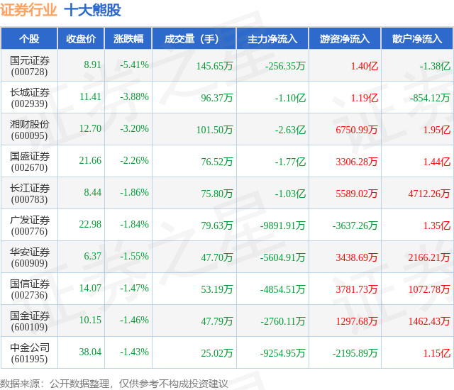 个股表现方面,证券行业当日领跌股为国元证券(000728),该股当日报收8.91,下跌5.41%,成交量145.65万,主力资金净流出256.35万元。长城证券(002939)以下跌3.88%紧随其后,该股当日成交量96.37万,主力资金净流出1.1亿元。除此之外,湘财股份(600095)、国盛证券(002670)、长江证券(000783)均进入当日熊股之列。具体个股列表见下表: