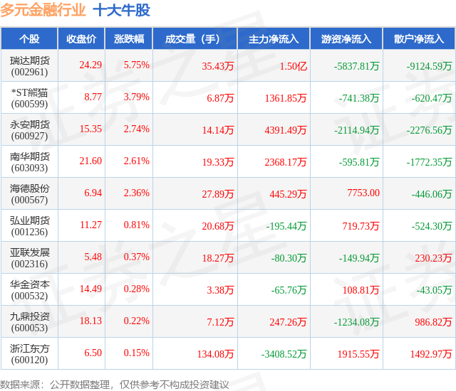 个股表现方面,多元金融行业当日领涨股为瑞达期货(002961),该股当日报收24.29,上涨5.75%,成交量35.43万,主力资金净流入1.5亿元。*ST熊猫(600599)以上涨3.79%紧随其后,该股当日成交量6.87万,主力资金净流入1361.85万元。除此之外,永安期货(600927)、南华期货(603093)、海德股份(000567)均进入当日牛股之列。具体个股列表见下表: