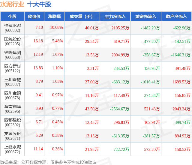 个股表现方面,水泥行业当日领涨股为福建水泥(600802),该股当日报收7.1,上涨10.08%,成交量40.01万,主力资金净流入2105.25万元。国统股份(002205)以上涨5.48%紧随其后,该股当日成交量29.54万,主力资金净流入619.71万元。除此之外,尖峰集团(600668)、四方新材(605122)、三和管桩(003037)均进入当日牛股之列。具体个股列表见下表: