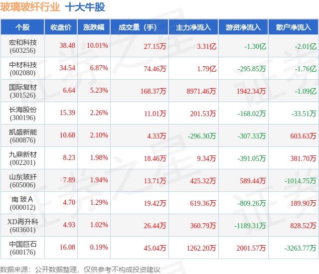 个股表现方面,玻璃玻纤行业当日领涨股为宏和科技(603256),该股当日报收38.48,上涨10.01%,成交量27.15万,主力资金净流入3.31亿元。中材科技(002080)以上涨6.87%紧随其后,该股当日成交量74.46万,主力资金净流入1.79亿元。除此之外,国际复材(301526)、长海股份(300196)、凯盛新能(600876)均进入当日牛股之列。具体个股列表见下表: