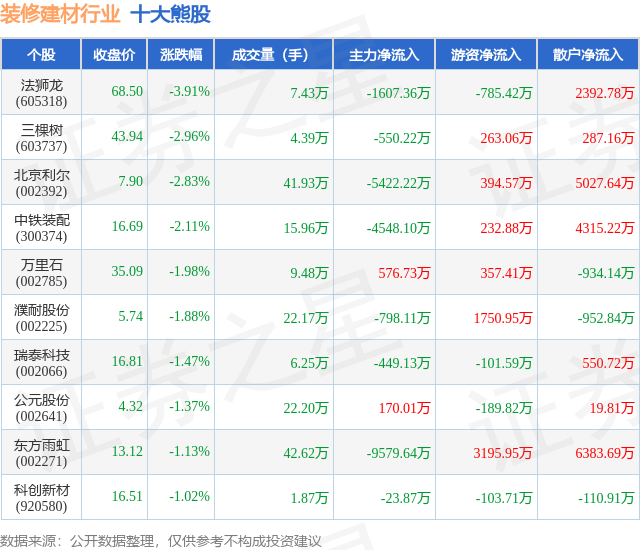个股表现方面,装修建材行业当日领跌股为法狮龙(605318),该股当日报收68.5,下跌3.91%,成交量7.43万,主力资金净流出1607.36万元。三棵树(603737)以下跌2.96%紧随其后,该股当日成交量4.39万,主力资金净流出550.22万元。除此之外,北京利尔(002392)、中铁装配(300374)、万里石(002785)均进入当日熊股之列。具体个股列表见下表: