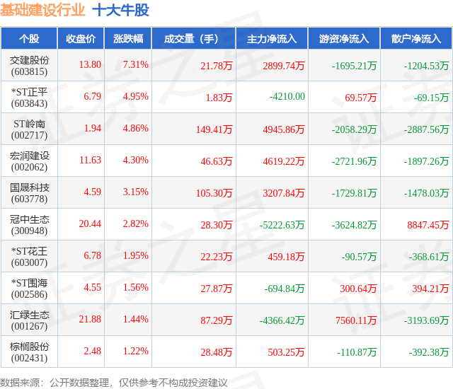 个股表现方面,基础建设行业当日领涨股为交建股份(603815),该股当日报收13.8,上涨7.31%,成交量21.78万,主力资金净流入2899.74万元。*ST正平(603843)以上涨4.95%紧随其后,该股当日成交量1.83万,主力资金净流出0.42万元。除此之外,ST岭南(002717)、宏润建设(002062)、国晟科技(603778)均进入当日牛股之列。具体个股列表见下表: