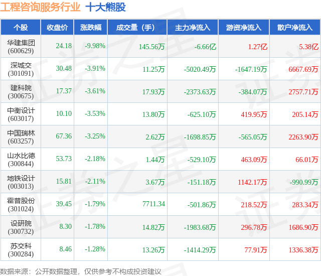 个股表现方面,工程咨询服务行业当日领跌股为华建集团(600629),该股当日报收24.18,下跌9.98%,成交量145.56万,主力资金净流出6.66亿元。深城交(301091)以下跌3.91%紧随其后,该股当日成交量11.25万,主力资金净流出5020.49万元。除此之外,建科院(300675)、中衡设计(603017)、中国瑞林(603257)均进入当日熊股之列。具体个股列表见下表: