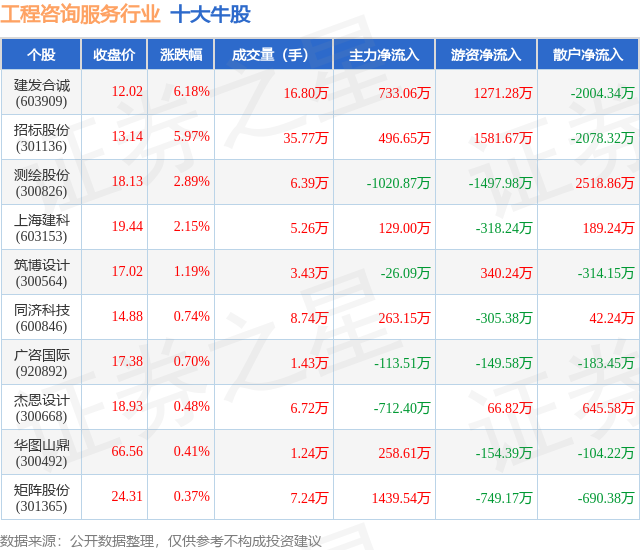个股表现方面,工程咨询服务行业当日领涨股为建发合诚(603909),该股当日报收12.02,上涨6.18%,成交量16.8万,主力资金净流入733.06万元。招标股份(301136)以上涨5.97%紧随其后,该股当日成交量35.77万,主力资金净流入496.65万元。除此之外,测绘股份(300826)、上海建科(603153)、筑博设计(300564)均进入当日牛股之列。具体个股列表见下表: