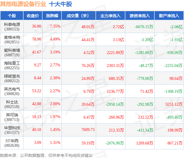 个股表现方面,其他电源设备行业当日领涨股为科泰电源(300153),该股当日报收36.8,上涨7.35%,成交量48.01万,主力资金净流入2.72亿元。麦格米特(002851)以上涨4.49%紧随其后,该股当日成交量44.41万,主力资金净流入3.13亿元。除此之外,爱科赛博(688719)、海陆重工(002255)、绿能慧充(600212)均进入当日牛股之列。具体个股列表见下表: