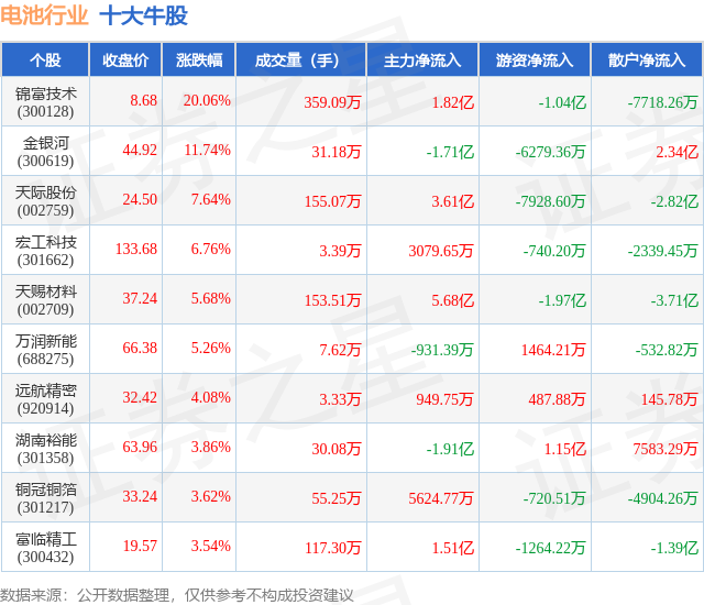 个股表现方面,电池行业当日领涨股为锦富技术(300128),该股当日报收8.68,上涨20.06%,成交量359.09万,主力资金净流入1.82亿元。金银河(300619)以上涨11.74%紧随其后,该股当日成交量31.18万,主力资金净流出1.71亿元。除此之外,天际股份(002759)、宏工科技(301662)、天赐材料(002709)均进入当日牛股之列。具体个股列表见下表: