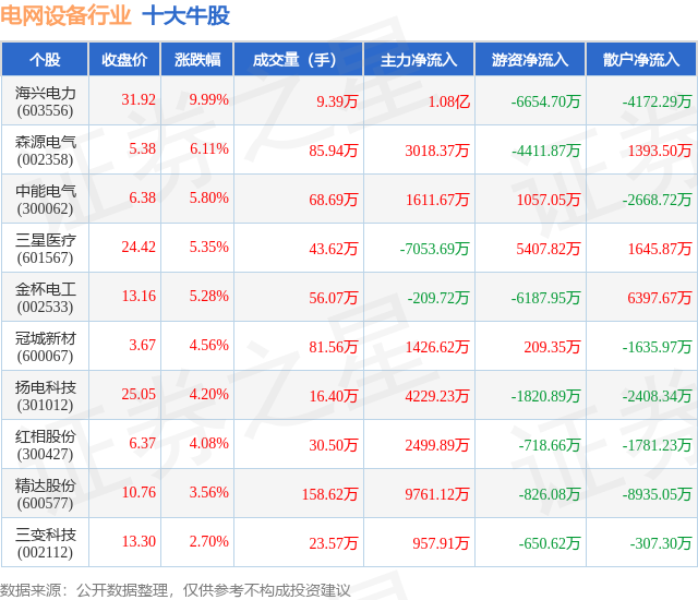 个股表现方面,电网设备行业当日领涨股为海兴电力(603556),该股当日报收31.92,上涨9.99%,成交量9.39万,主力资金净流入1.08亿元。森源电气(002358)以上涨6.11%紧随其后,该股当日成交量85.94万,主力资金净流入3018.37万元。除此之外,中能电气(300062)、三星医疗(601567)、金杯电工(002533)均进入当日牛股之列。具体个股列表见下表: