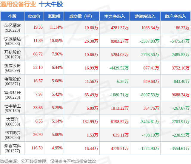 个股表现方面,通用设备行业当日领涨股为荣亿精密(920223),该股当日报收19.35,上涨11.14%,成交量10.6万,主力资金净流入4281.37万元。宁波精达(603088)以上涨10.05%紧随其后,该股当日成交量26.38万,主力资金净流入8983.27万元。除此之外,开勒股份(301070)、纽威股份(603699)、伟隆股份(002871)均进入当日牛股之列。具体个股列表见下表: