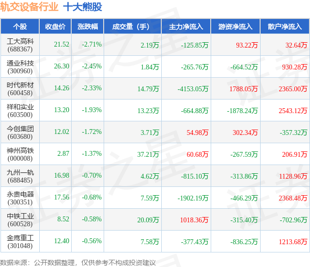 个股表现方面,轨交设备行业当日领跌股为工大高科(688367),该股当日报收21.52,下跌2.71%,成交量2.19万,主力资金净流出125.85万元。通业科技(300960)以下跌2.45%紧随其后,该股当日成交量1.84万,主力资金净流出265.76万元。除此之外,时代新材(600458)、祥和实业(603500)、今创集团(603680)均进入当日熊股之列。具体个股列表见下表:
