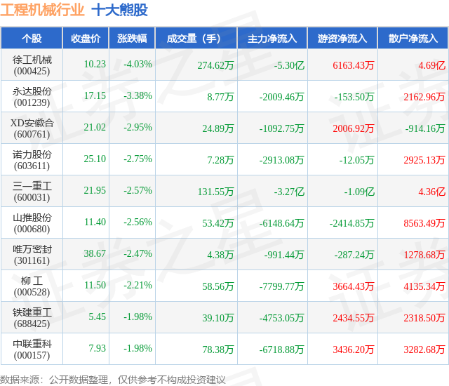 个股表现方面,工程机械行业当日领跌股为徐工机械(000425),该股当日报收10.23,下跌4.03%,成交量274.62万,主力资金净流出5.3亿元。永达股份(001239)以下跌3.38%紧随其后,该股当日成交量8.77万,主力资金净流出2009.46万元。除此之外,XD安徽合(600761)、诺力股份(603611)、三一重工(600031)均进入当日熊股之列。具体个股列表见下表: