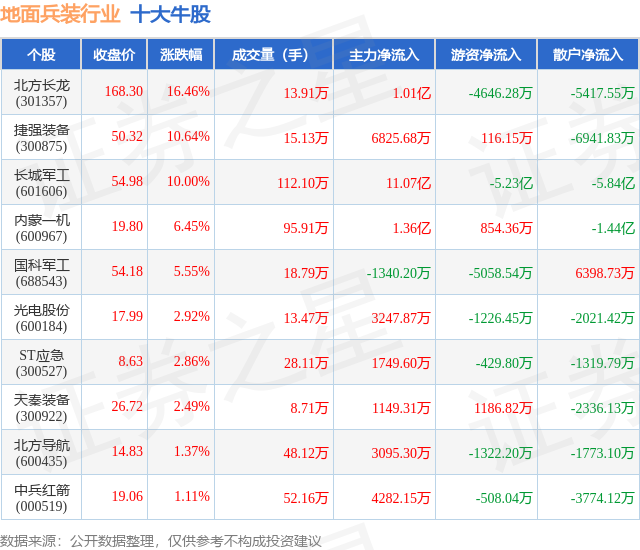 个股表现方面,地面兵装行业当日领涨股为北方长龙(301357),该股当日报收168.3,上涨16.46%,成交量13.91万,主力资金净流入1.01亿元。捷强装备(300875)以上涨10.64%紧随其后,该股当日成交量15.13万,主力资金净流入6825.68万元。除此之外,长城军工(601606)、内蒙一机(600967)、国科军工(688543)均进入当日牛股之列。具体个股列表见下表: