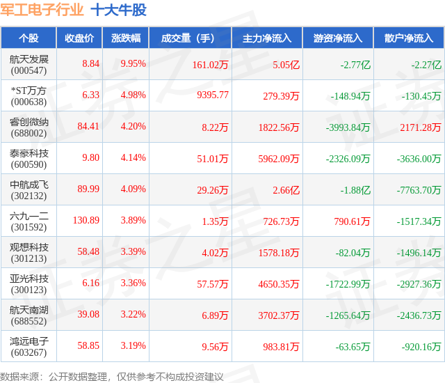 个股表现方面,军工电子行业当日领涨股为航天发展(000547),该股当日报收8.84,上涨9.95%,成交量161.02万,主力资金净流入5.05亿元。*ST万方(000638)以上涨4.98%紧随其后,该股当日成交量9396.0,主力资金净流入279.39万元。除此之外,睿创微纳(688002)、泰豪科技(600590)、中航成飞(302132)均进入当日牛股之列。具体个股列表见下表: