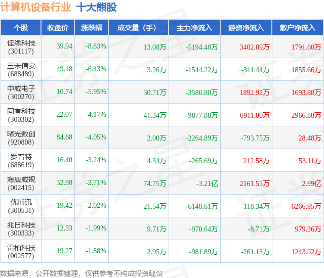 个股表现方面,计算机设备行业当日领跌股为佳缘科技(301117),该股当日报收39.94,下跌8.83%,成交量13.08万,主力资金净流出5194.48万元。三未信安(688489)以下跌6.43%紧随其后,该股当日成交量3.26万,主力资金净流出1544.22万元。除此之外,中威电子(300270)、同有科技(300302)、曙光数创(920808)均进入当日熊股之列。具体个股列表见下表: