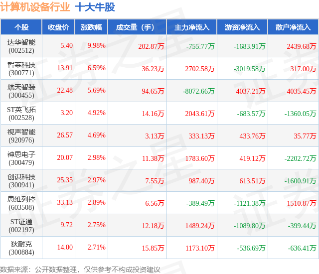 个股表现方面,计算机设备行业当日领涨股为达华智能(002512),该股当日报收5.4,上涨9.98%,成交量202.87万,主力资金净流出755.77万元。智莱科技(300771)以上涨6.59%紧随其后,该股当日成交量36.23万,主力资金净流入2702.58万元。除此之外,航天智装(300455)、ST英飞拓(002528)、视声智能(920976)均进入当日牛股之列。具体个股列表见下表: