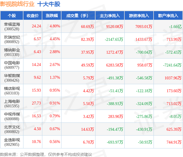 个股表现方面,影视院线行业当日领涨股为幸福蓝海(300528),该股当日报收24.24,上涨4.8%,成交量60.69万,主力资金净流入9520.08万元。欢瑞世纪(000892)以上涨4.45%紧随其后,该股当日成交量82.39万,主力资金净流出2147.65万元。除此之外,博纳影业(001330)、中国电影(600977)、华智数媒(300426)均进入当日牛股之列。具体个股列表见下表: