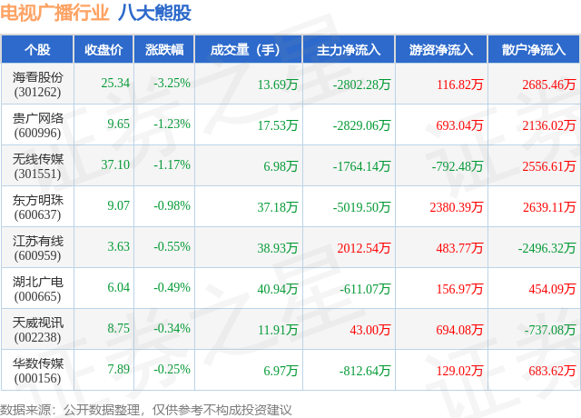 个股表现方面,电视广播行业当日领跌股为海看股份(301262),该股当日报收25.34,下跌3.25%,成交量13.69万,主力资金净流出2802.28万元。贵广网络(600996)以下跌1.23%紧随其后,该股当日成交量17.53万,主力资金净流出2829.06万元。除此之外,无线传媒(301551)、东方明珠(600637)、江苏有线(600959)均进入当日熊股之列。具体个股列表见下表: