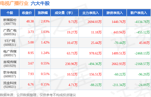 个股表现方面,电视广播行业当日领涨股为新媒股份(300770),该股当日报收48.38,上涨2.83%,成交量9.73万,主力资金净流入2694.03万元。广西广电(600936)以上涨1.63%紧随其后,该股当日成交量19.27万,主力资金净流入11.18万元。除此之外,ST广网(600831)、电广传媒(000917)、吉视传媒(601929)均进入当日牛股之列。具体个股列表见下表: