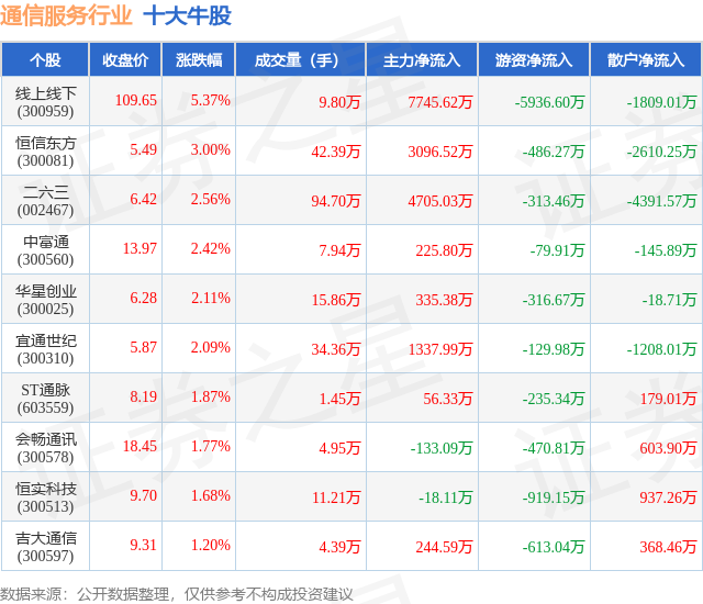 个股表现方面,通信服务行业当日领涨股为线上线下(300959),该股当日报收109.65,上涨5.37%,成交量9.8万,主力资金净流入7745.62万元。恒信东方(300081)以上涨3.0%紧随其后,该股当日成交量42.39万,主力资金净流入3096.52万元。除此之外,二六三(002467)、中富通(300560)、华星创业(300025)均进入当日牛股之列。具体个股列表见下表: