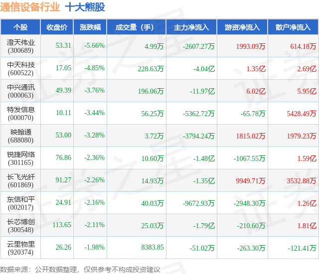 个股表现方面,通信设备行业当日领跌股为澄天伟业(300689),该股当日报收53.31,下跌5.66%,成交量4.99万,主力资金净流出2607.27万元。中天科技(600522)以下跌4.85%紧随其后,该股当日成交量228.63万,主力资金净流出4.04亿元。除此之外,中兴通讯(000063)、特发信息(000070)、映翰通(688080)均进入当日熊股之列。具体个股列表见下表: