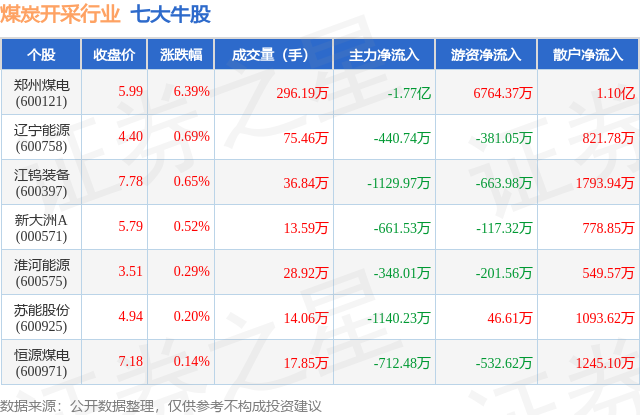 个股表现方面,煤炭开采行业当日领涨股为郑州煤电(600121),该股当日报收5.99,上涨6.39%,成交量296.19万,主力资金净流出1.77亿元。辽宁能源(600758)以上涨0.69%紧随其后,该股当日成交量75.46万,主力资金净流出440.74万元。除此之外,江钨装备(600397)、新大洲A(000571)、淮河能源(600575)均进入当日牛股之列。具体个股列表见下表: