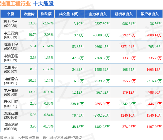 个股表现方面,油服工程行业当日领跌股为科力股份(920088),该股当日报收33.85,下跌2.67%,成交量3.1万,主力资金净流出2327.3万元。中曼石油(603619)以下跌2.08%紧随其后,该股当日成交量9.41万,主力资金净流出3600.61万元。除此之外,海油工程(600583)、中油工程(600339)、准油股份(002207)均进入当日熊股之列。具体个股列表见下表: