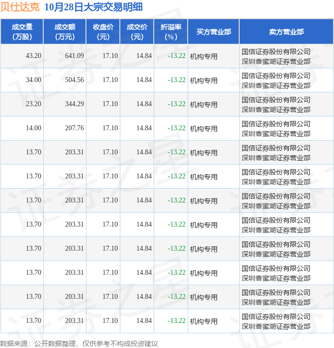 证券之星消息,10月28日贝仕达克发生大宗交易,交易数据如下: