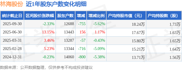 从股价来看,2025年6月30日至2025年9月30日,林海股份区间跌幅为2.33%,在此期间股东户数减少755.0户,减幅为5.62%。
