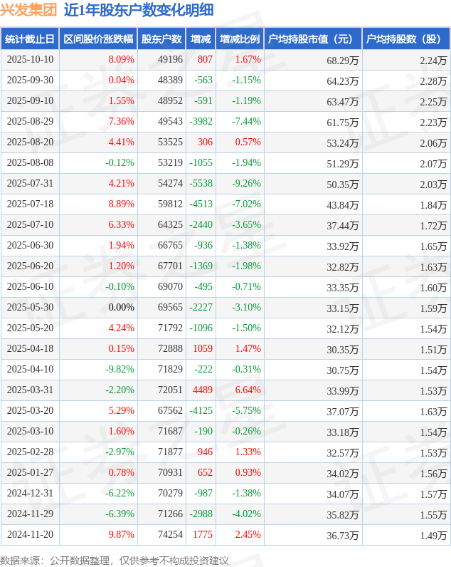 从股价来看,2025年9月30日至2025年10月10日,兴发集团区间涨幅为8.09%,在此期间股东户数增加807.0户,增幅为1.67%。