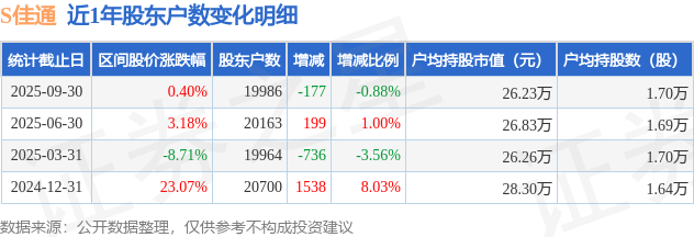 从股价来看,2025年6月30日至2025年9月30日,S佳通区间涨幅为0.4%,在此期间股东户数减少177.0户,减幅为0.88%。