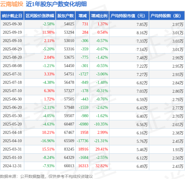 从股价来看,2025年9月19日至2025年9月30日,云南城投区间跌幅为2.58%,在此期间股东户数增加731.0户,增幅为1.37%。