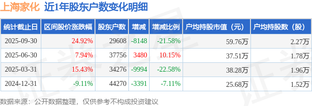 从股价来看,2025年6月30日至2025年9月30日,上海家化区间涨幅为24.92%,在此期间股东户数减少8148.0户,减幅为21.58%。