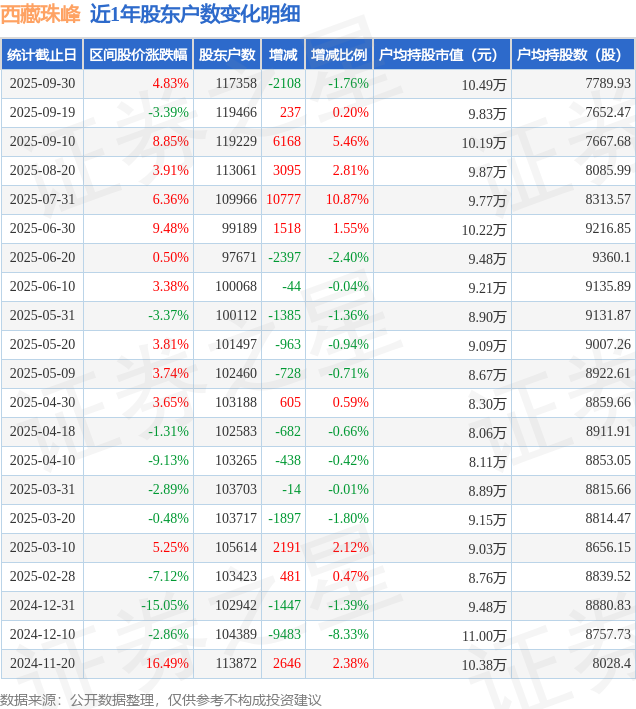 从股价来看,2025年9月19日至2025年9月30日,西藏珠峰区间涨幅为4.83%,在此期间股东户数减少2108.0户,减幅为1.76%。